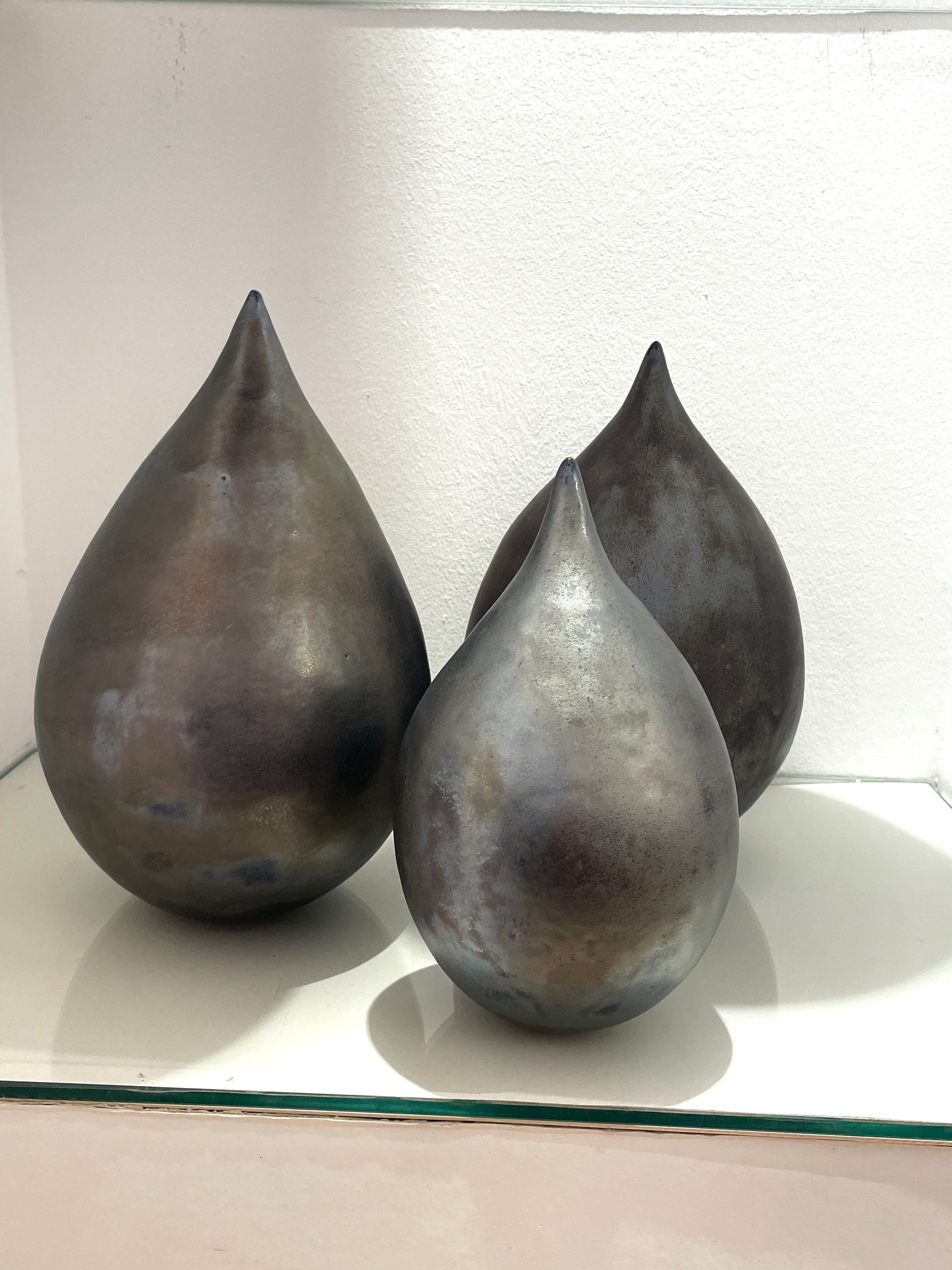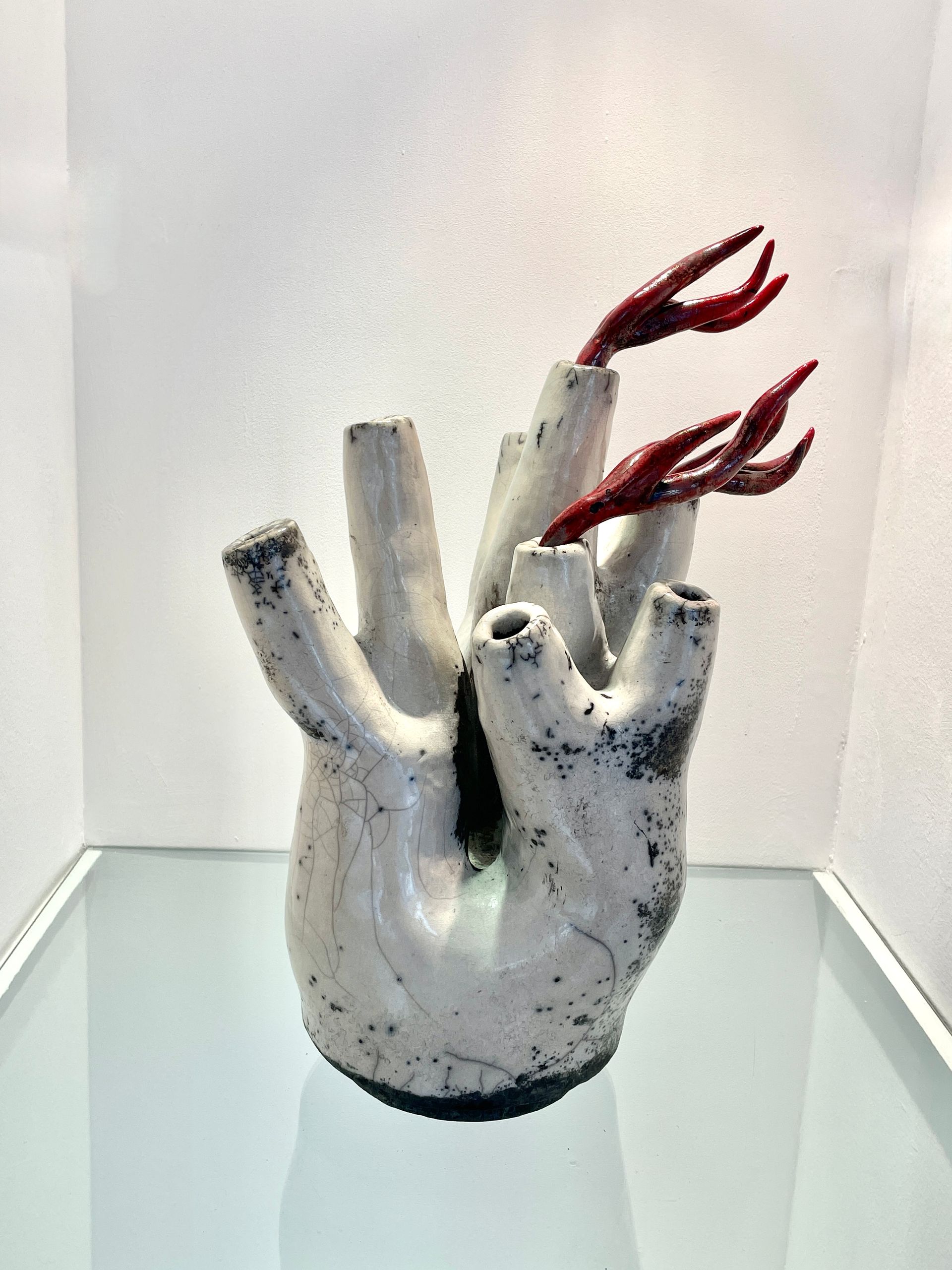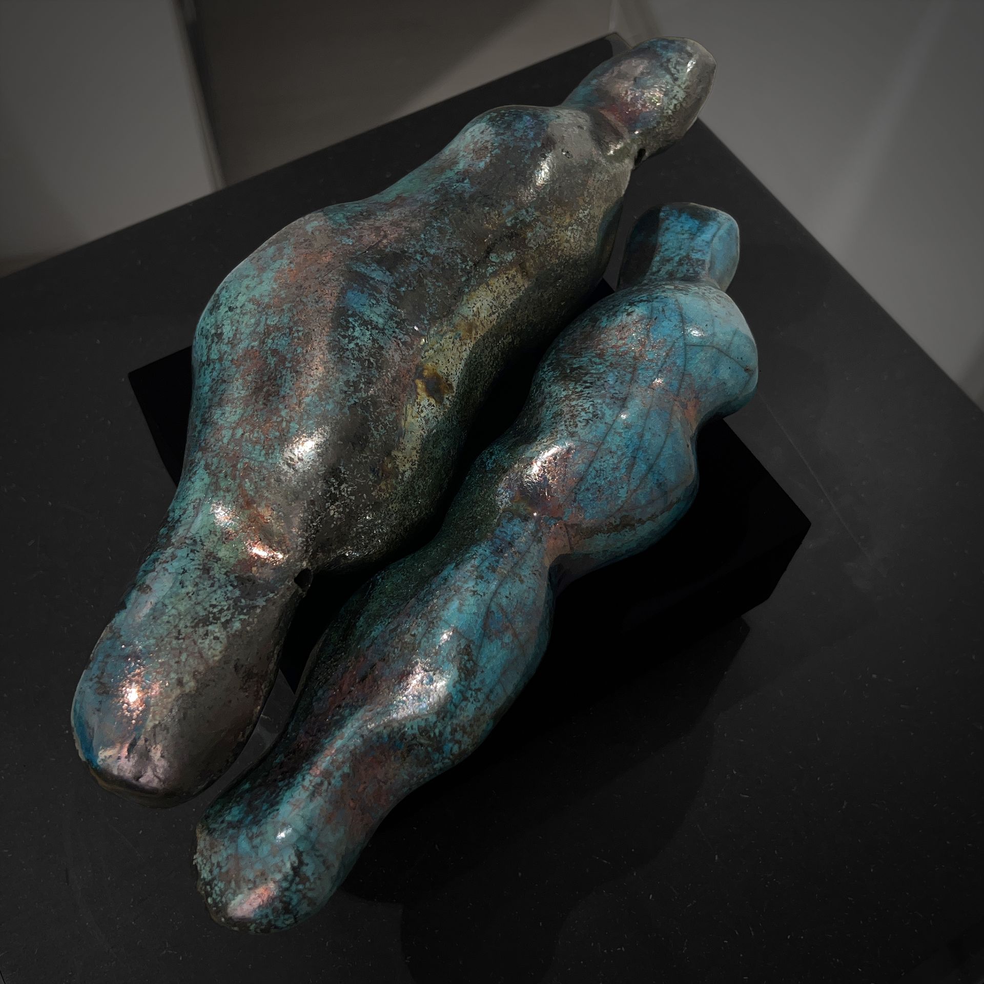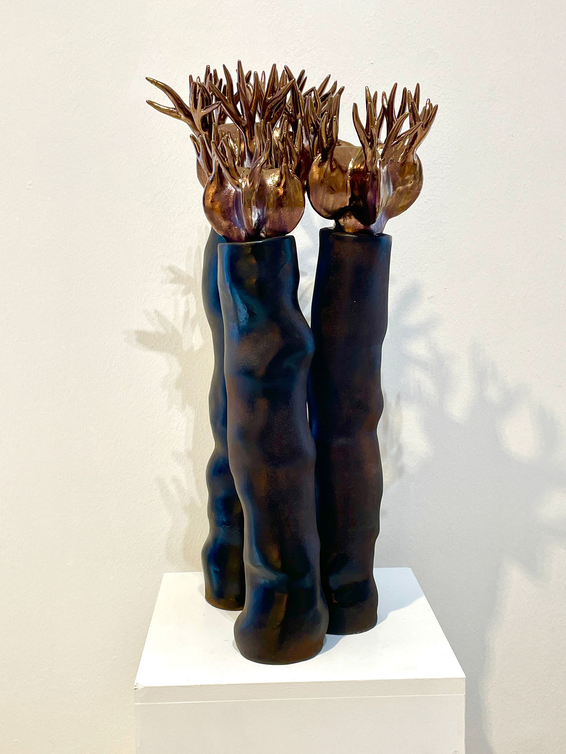 Einen anderen, beinahe entgegengesetzten Weg geht Renata Kolwicz. Als Bildhauerin arbeitet sie mit Keramik, einem Material, das Zeit, Hitze und Zufall in sich trägt. Ein Schwerpunkt liegt auf Skulpturen, die in der japanischen Raku-Technik entstanden sind. Ihre Formen erinnern an natürliche Wachstums- und Wandlungsprozesse, ohne sie abzubilden. Bewegung wird hier nicht gezeigt, sondern angehalten – als Momentaufnahme eines fortwährenden Geschehens, eingefroren im amorphen Körper der Skulptur.