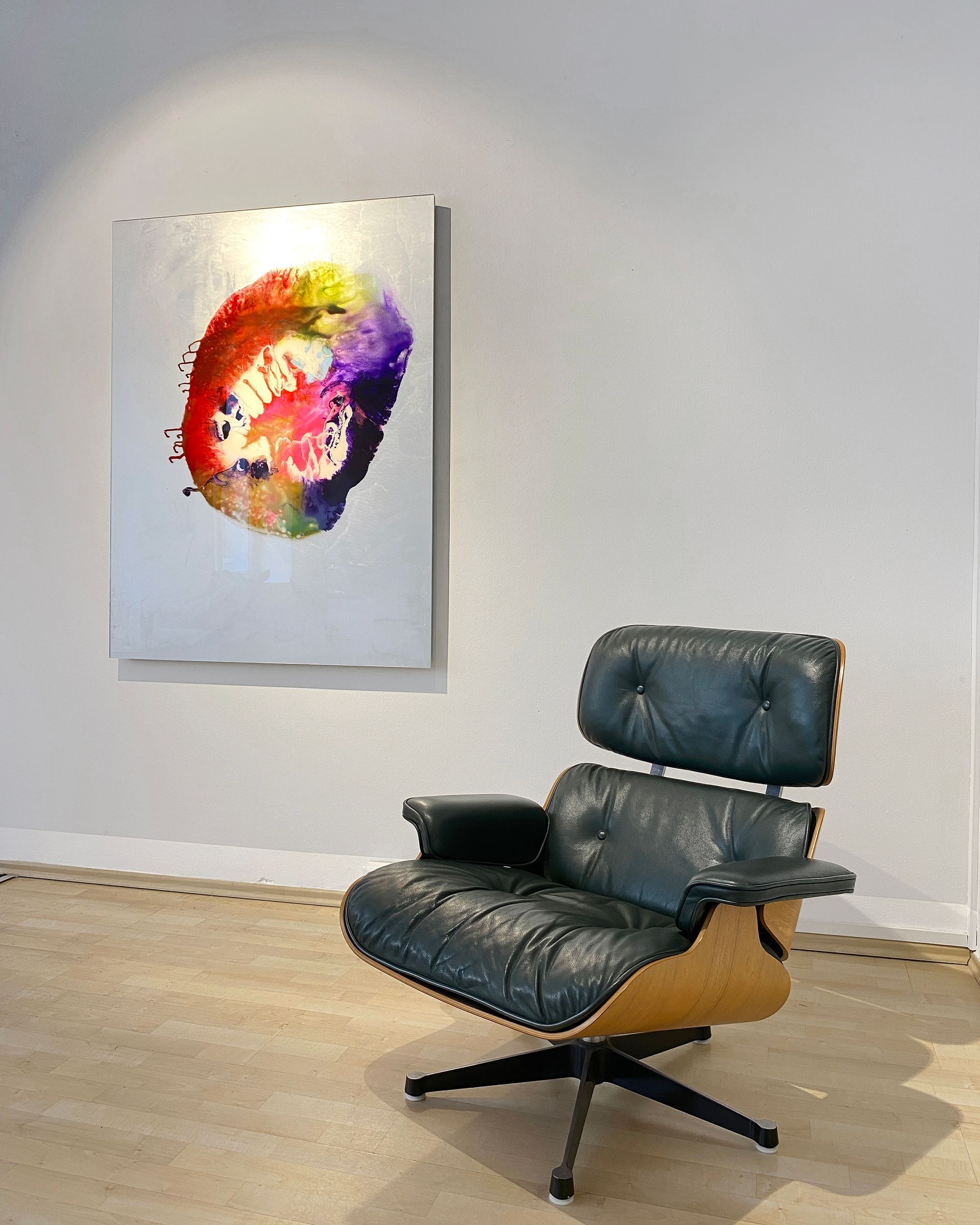 Through the added construction of a reverse frame via a special adhesive technique, this unique way of painting acquires an outstanding presence of a frameless, "free-floating" pane.